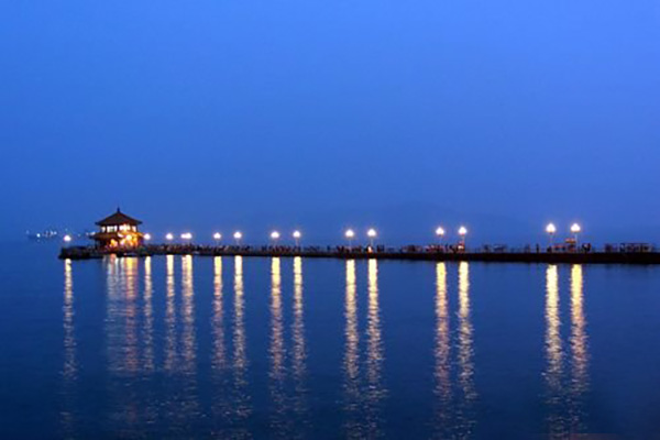 成一直线相连,素有“长虹远引”之美誉,被视为青岛市重要标志。 栈桥始建于清光绪年间,是青岛最早的军事专用人工码头。栈桥两边有铁链护栏和莲花路灯,游人漫步于栈桥海滨,风平浪静时,可观看海鸥在此自由翱翔。青岛火车站步行至栈桥约10分钟路程。